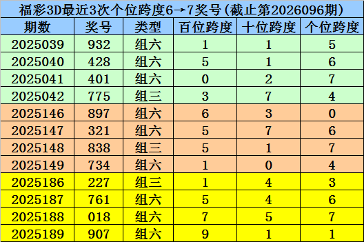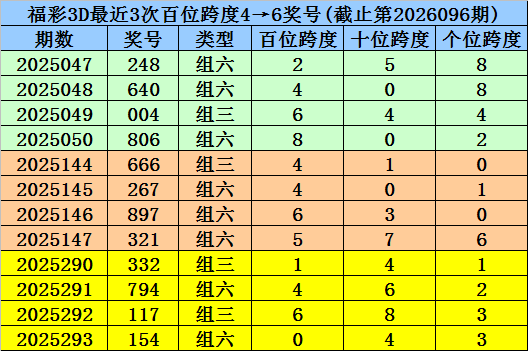 首位跨度分析:首位号码最近3期奖号为4-0-6,连续两期跨度为4、6,历史上首位号码连续两期分别开出跨度4、6的现象共出现70次,其前两次开出奖号分别为: